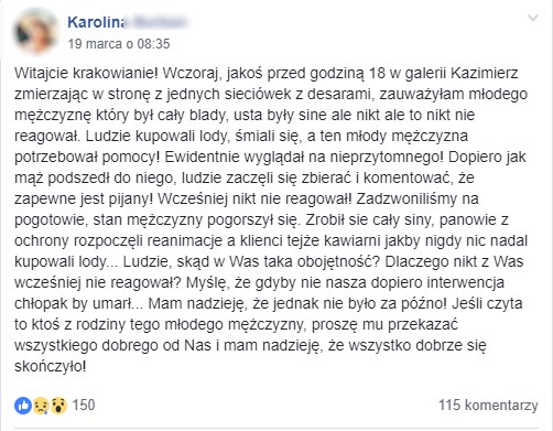 „Witajcie krakowianie! Wczoraj, jakoś przed godziną 18 w galerii Kazimierz zmierzając w stronę z jednych sieciówek z deserami, zauważyłam młodego mężczyznę który był cały blady, usta były sine ale nikt ale to nikt nie reagował.” – opisuje Pani Karolina.