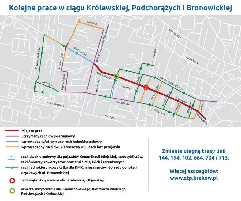 W nocy z 19. na 20 maja z powodu prac na torowisku do Bronowic zostaną wprowadzone kolejne zmiany. Zamknięta zostanie południowa części skrzyżowania Bronowickiej i Rydla, a na odcinku Bronowickiej między Głowackiego, a Rydla będzie możliwość jazdy w stronę ulicy Rydla (jeden kierunek) dla komunikacji miejskiej i mieszkańców. Zachowany zostanie również dojazd do lokali użytkowych. Na podstawie bieżącej obserwacji ruchu na tym odcinku, może jednak zostać jeszcze podjęta decyzja o dopuszczeniu tu do ruchu również samochodów.