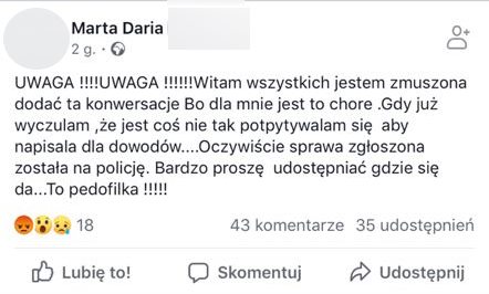 „UWAGA !!!!UWAGA !!!!!!Witam wszystkich jestem zmuszona dodać ta konwersacje Bo dla mnie jest to chore .Gdy już wyczulam ,że jest coś nie tak potpytywalam się aby napisala dla dowodów….Oczywiście sprawa zgłoszona została na policję. Bardzo proszę udostępniać gdzie się da…To pedofilka !!!!!” – pisze Pani Marta.