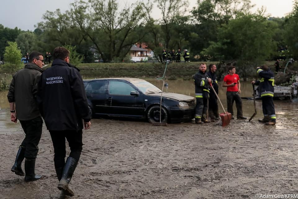 Premier Mateusz Morawiecki przybył do miejscowości Głogoczów: W bardzo krótkim czasie gwałtownie zalane zostało kilka gospodarstw, na szczęście nikomu nic się nie stało.