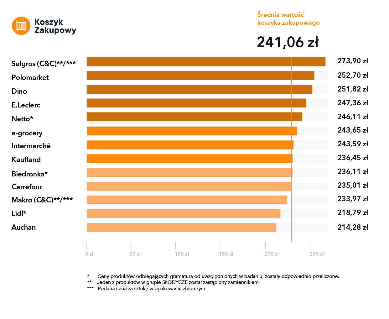 Największy wzrost średniej ceny koszyka zakupowego miał miejsce w sieci Auchan (7,59%). Natomiast w ujęciu rocznym wzrost cen odnotowano w ośmiu sieciach wobec 2021 roku. Były to min.: Carrefour (8,79%), Intermarché (9,00%) czy E.Leclerc (10,73%). Największy wzrost cen koszyka odnotowano w sieci Selgros Cash&Carry, w której średnia cena koszyka w maju 2022 r. była wyższa aż o 43,88 zł niż przed rokiem, tj. o 19%.