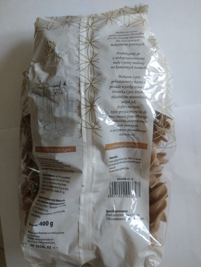 Produkt: Bartolini Eko makaron 100 % żytni pełnoziarnisty (ekologiczny), muszla Nr 2, masa netto 400 g,
