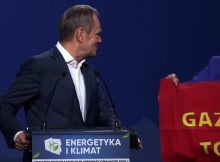 Donald Tusk przemawiał na kongresie programowym Platformy Obywatelskiej. W pewnym momencie przy jego boku pojawił się aktywista z napisem: „Gaz ziemny to broń dyktatorów”.