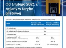 1 lutego wchodzą w życie zmiany w cenniku biletów Komunikacji Miejskiej w Krakowie. Nowe stawki obejmą bilety jednorazowe, jak i miesięczne.